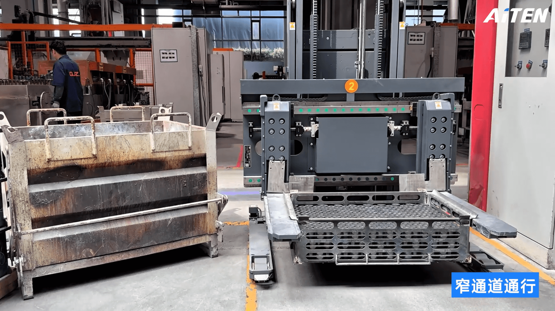 ①宽叉腿结构:适配客户地面固定式宽间距料架,提升搬运稳定性;