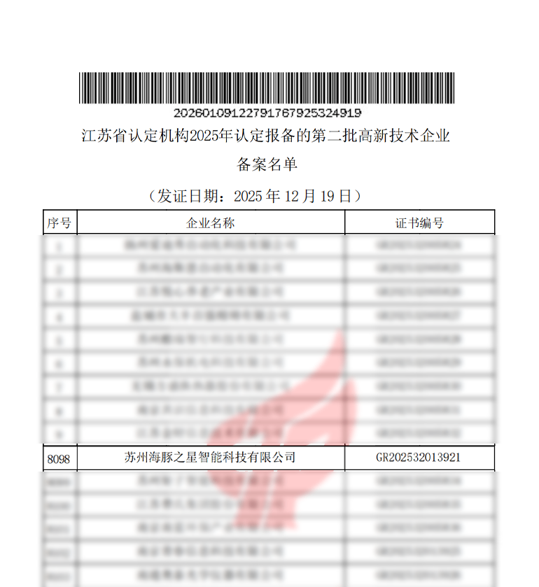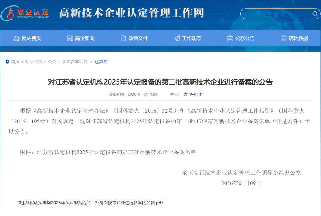 近日,根据《高新技术企业认定管理办法》及相关规定,全国高新技术企业认定管理工作领导小组办公室对江苏省认定机构2025年认定报备的第二批企业进行备案公示。九游娱乐凭借其扎实的科技创新实力与完善的研发管理体系,成功荣列在本次备案中。
